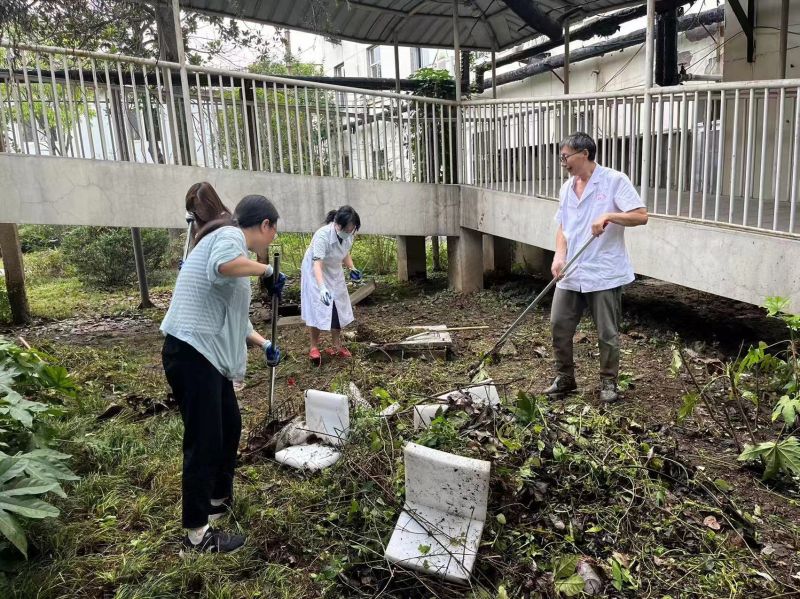 清潔活動實行包干到組。院內(nèi)各個綠化區(qū)分成26個區(qū)域,由全院各科室分為26個小組負(fù)責(zé),每個小組設(shè)包干院領(lǐng)導(dǎo)和責(zé)任人。由于剛剛完成修剪工作,綠化區(qū)表面布滿了厚厚的樹枝及樹葉,加之連下幾天大雨,地面潮濕,腐爛的樹葉發(fā)出刺鼻的霉味,給清潔任務(wù)帶來了不便。
