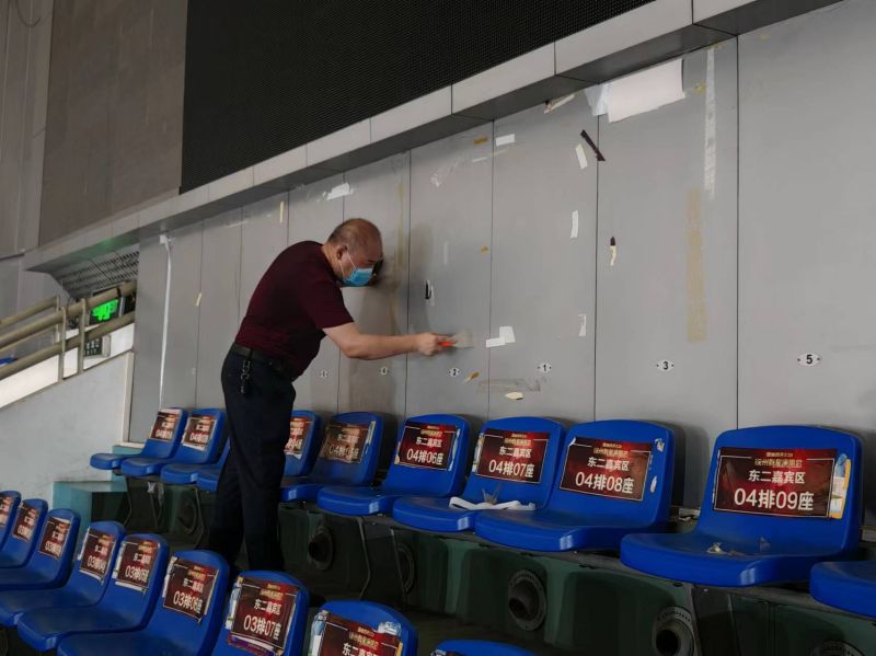 活動當天,全體黨員干部及部分不當班職工準時到達徐州體育館,按照預先分組進行任務分配,以主席臺為中心,向兩邊區(qū)域延伸進行地毯式清理。此次活動主要清理體育館內部四周墻體,摘除過期廣告牌、鏟除墻面標簽及清理觀眾席衛(wèi)生死角等。