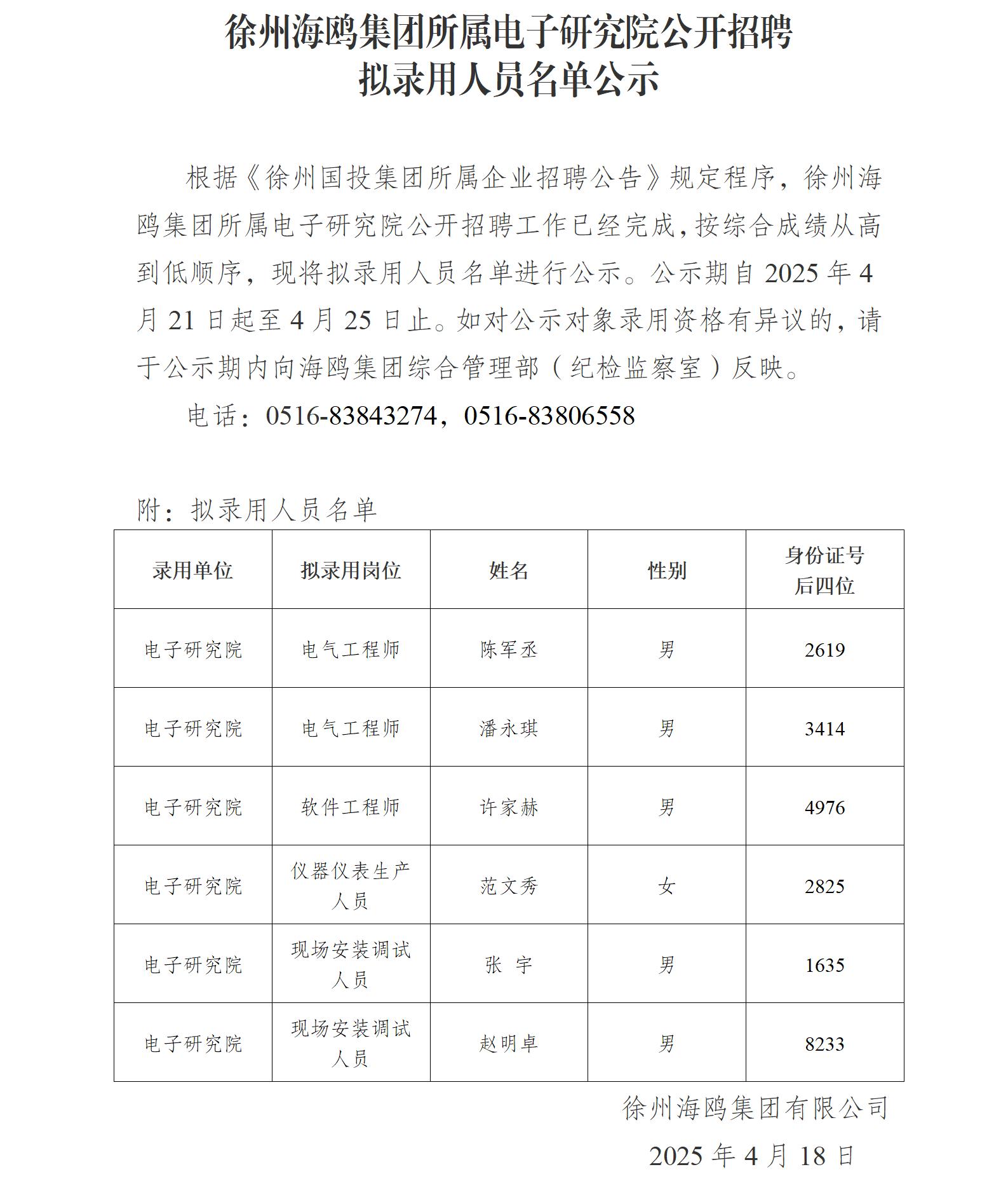 徐州海鷗集團(tuán)所屬電子研究院公開(kāi)招聘擬錄用人員名單公示