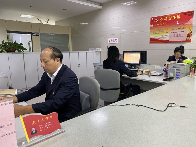 勞代支部根據(jù)工作實際,設(shè)立兩個黨員責(zé)任區(qū),分別為大廳服務(wù)區(qū)和檔案管理區(qū)。責(zé)任區(qū)內(nèi),做到“三亮”:第一,亮標(biāo)準(zhǔn)。區(qū)域內(nèi)懸掛“首問責(zé)任制”“一次性告知制”“限時辦結(jié)制”“服務(wù)承諾制”等相關(guān)業(yè)務(wù)辦理制度標(biāo)準(zhǔn)。第二,亮身份。黨員上崗一律主動佩戴黨徽,設(shè)置黨員先鋒崗,勇于公開黨員信息和照片,亮出黨員身份,主動接受群眾監(jiān)督。第三,亮承諾。在崗位顯著位置向辦事群眾公開黨員承諾內(nèi)容和黨員職責(zé),激勵黨員同志立足本職崗位做貢獻(xiàn),踐行黨員承諾。