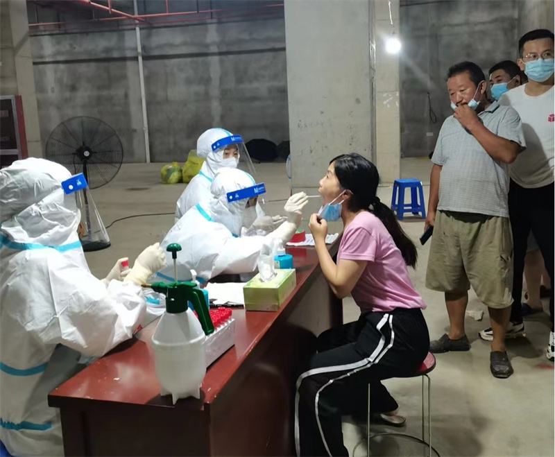 條件的簡陋,為采樣工作增加了難度。在炎熱的環(huán)境下,她們穿著密不透風(fēng)的防護(hù)服,帶著N95口罩、面屏和多層手套,不停地為持續(xù)不斷到來的居民進(jìn)行采樣。大到90多歲的老人,小到幾個月的嬰兒,一直戰(zhàn)斗到晚上11點(diǎn)多,在8個小時的時間里,憑著她們麻利地操作和熟練的技術(shù),共為4000人完成了核酸采樣。采樣結(jié)束后,有的姐妹累得撐不住了,脫了防護(hù)服,顧不得雨天地面的潮濕,直接躺在了生硬的水泥地上。