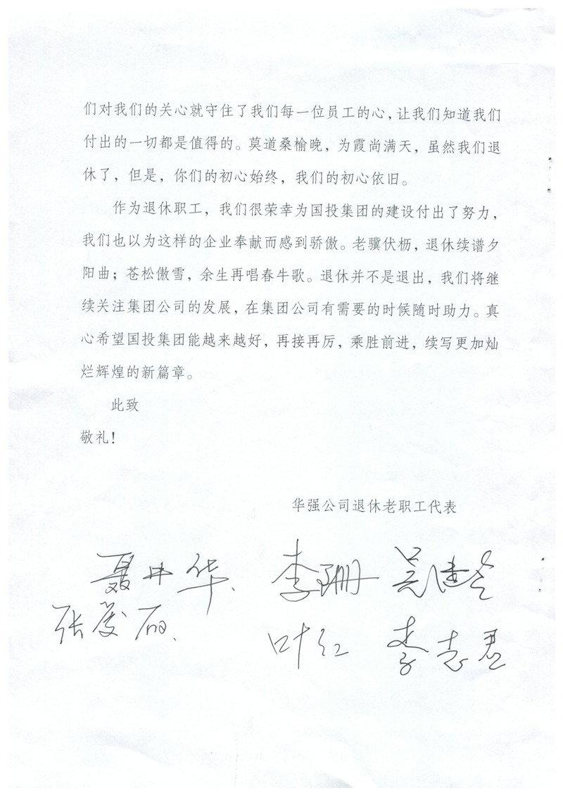 您們好!來信收悉。在中秋佳節(jié)之后,國(guó)慶即將來臨之時(shí),收到老同志們的來信,倍感親切,老同志們退休不退出,一直關(guān)心支持國(guó)投集團(tuán)改革發(fā)展情況并積極建言獻(xiàn)策的精神讓我們感動(dòng),正是由于像您們一樣的徐州國(guó)投老同志們的無私奉獻(xiàn)和精神感召,全集團(tuán)2000余名在崗職工勤勉履職,愛崗敬業(yè),開創(chuàng)了徐州國(guó)投來之不易的發(fā)展成績(jī),我們表示非常感謝,并向您們和國(guó)投集團(tuán)全體退休老同志致以誠(chéng)摯的問候!