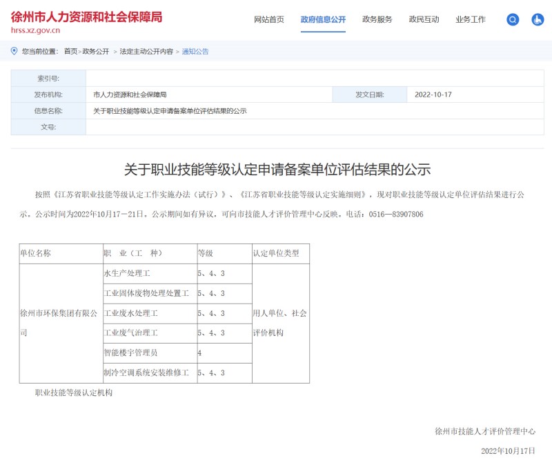 徐州市環(huán)保集團(tuán)評價中心通過徐州市人力資源和社會保障局審批。按照《江蘇省職業(yè)技能等級認(rèn)定工作實(shí)施辦法(試行)》《江蘇省職業(yè)技能等級認(rèn)定實(shí)施細(xì)則》,徐州市環(huán)保集團(tuán)有限公司成為水生產(chǎn)處理工、工業(yè)固體廢物處理處置工、工業(yè)廢水處理工、工業(yè)廢氣治理工、制冷空調(diào)系統(tǒng)安裝維修工的5、4、3級以及智能樓宇管理員4級的職業(yè)技能等級認(rèn)定機(jī)構(gòu)。