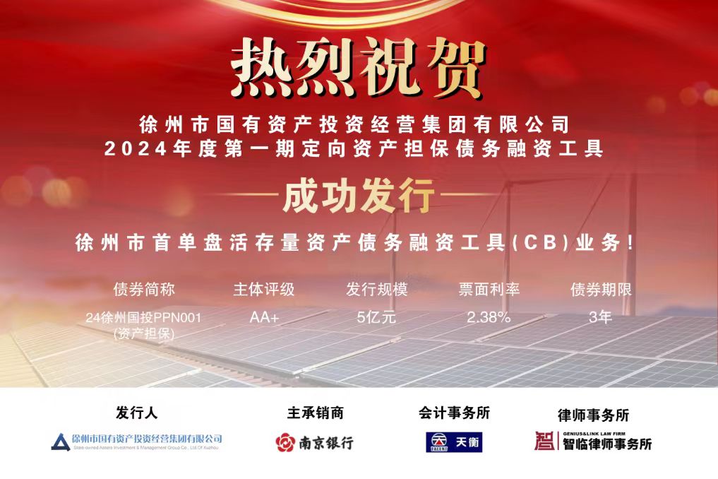 近期,徐州市國(guó)有資產(chǎn)投資經(jīng)營(yíng)集團(tuán)有限公司(簡(jiǎn)稱“徐州國(guó)投集團(tuán)”)2024年度第一期定向資產(chǎn)擔(dān)保債務(wù)融資工具成功發(fā)行,規(guī)模5億元,期限3年,票面利率2.38%。