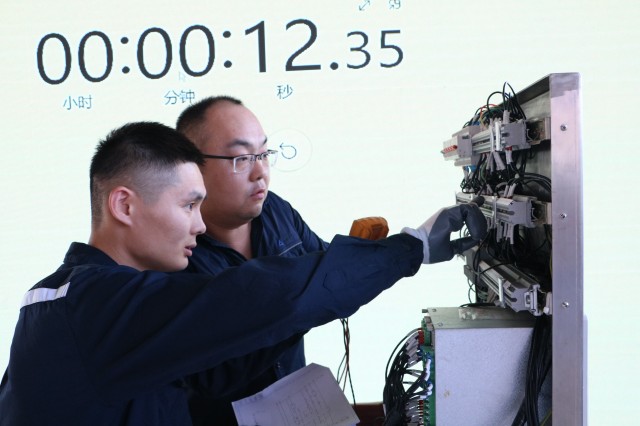 練兵場(chǎng)亦是競(jìng)技臺(tái)。15時(shí)30分,高壓開關(guān)柜回路故障消缺實(shí)操比賽開始。多支參賽隊(duì)伍輪番上陣,在裁判嚴(yán)格監(jiān)督下展開較量。面對(duì)預(yù)設(shè)的復(fù)雜回路故障,選手們身著統(tǒng)一工裝,佩戴齊整防護(hù),審閱圖紙、測(cè)試分析、精準(zhǔn)排障。每一次舉手示意操作、每一次工具精準(zhǔn)落點(diǎn),都體現(xiàn)著“安全第一、規(guī)范先行”的鐵律。賽場(chǎng)氣氛緊張激烈,選手們沉著冷靜的故障診斷能力與嫻熟的動(dòng)手能力贏得陣陣贊嘆。
