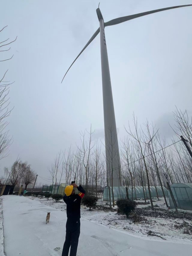 作業(yè)過程中,運維人員嚴格執(zhí)行“先關(guān)鍵設(shè)備、后輔助區(qū)域”原則,全員投入除雪保供一線。大家手持鐵鍬、掃帚等工具,全力清理升壓站主干道積雪積冰,搶通設(shè)備巡檢“生命線”,保障巡檢作業(yè)順利開展。充分運用無人機、望遠鏡、紅外測溫儀等設(shè)備,重點排查風機葉片覆冰、集電線路有無異常等情況,同時組織人員逐戶上門發(fā)放《風機覆冰安全告知書》,詳細告知風機附近居民風機覆冰可能引發(fā)的墜冰風險,重點提醒居民在雨雪冰凍天氣減少戶外逗留、遠離風機塔筒及葉片旋轉(zhuǎn)覆蓋區(qū)域,切實筑牢設(shè)備安全運行與居民人身安全“雙防線”。