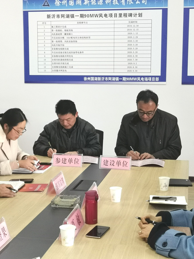 為進一步嚴(yán)格貫徹落實集團公司黨委工程建設(shè)廉潔從業(yè)決策部署,有效從源頭預(yù)防各類違規(guī)違紀(jì)違法行為發(fā)生,為新沂市阿湖鎮(zhèn)一期90MW風(fēng)電項目工程建設(shè)、項目管理營造良好的廉潔環(huán)境。12月3日下午,國投環(huán)能公司全資企業(yè)徐州國湖新能源科技有限公司(以下簡稱“國湖公司”)在新沂市阿湖鎮(zhèn)便民服務(wù)中心舉行了《工程建設(shè)廉潔從業(yè)責(zé)任書》簽字儀式。國投環(huán)能公司黨總支書記、國湖公司董事長孫雷,國投環(huán)能公司紀(jì)檢聯(lián)系人,國湖公司風(fēng)電項目部代表及工程總承包、項目監(jiān)理、跟蹤審計等參建單位代表參加了儀式,簽字儀式由國投環(huán)能公司總經(jīng)理助理、國湖公司總經(jīng)理余躍主持。集團公司紀(jì)檢監(jiān)察室副主任夏敏到場見證簽訂儀式。