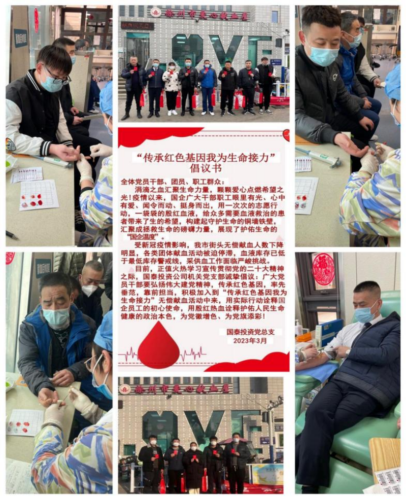 國泰投資黨總支發(fā)出了“傳承紅色基因 我為生命接力”無償獻(xiàn)血的活動倡議。國泰職工眼里有光,心中有愛,聞令而動,挺身而出,共計22名職工參與其中,累計獻(xiàn)血7200毫升,用忠誠熱血詮釋初心使命,展現(xiàn)了無私奉獻(xiàn)護(hù)佑生命的“國企溫度”。
