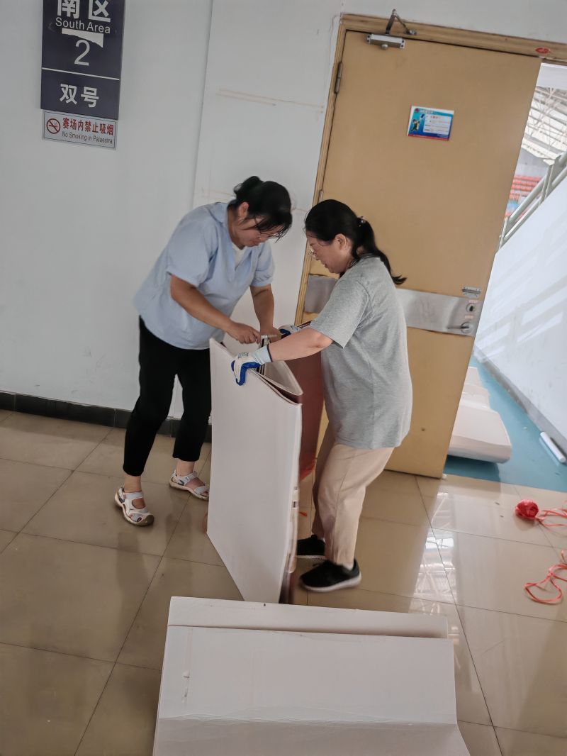 物業(yè)公司黨員干部及職工在館內酷熱的環(huán)境下,積極投入清掃工作中,分工合作,有的負責摘除過期廣告牌、有的負責清運廣告牌、有的負責鏟除墻體雙面膠、有的負責清理平臺衛(wèi)生、有的負責粘貼區(qū)域標志,嚴格實行不間斷的巡回式清理,不放過任何一處衛(wèi)生死角。經過大家一上午的努力,體育館內部環(huán)境煥然一新。