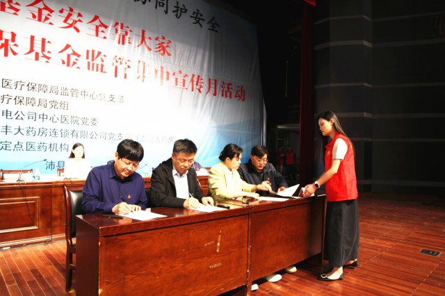啟動(dòng)儀式上,全體參會(huì)人員集體觀看了《醫(yī)?;鸨O(jiān)管警示教育片》,通過典型案例剖析,筑牢監(jiān)管防線。隨后,沛縣常務(wù)副縣長趙蓉發(fā)表致辭;縣醫(yī)療保障局傳達(dá)了國家及省市關(guān)于2025年打擊欺詐騙保專項(xiàng)工作文件精神,部署醫(yī)?;鸨O(jiān)管集中宣傳月重點(diǎn)任務(wù),并與醫(yī)藥機(jī)構(gòu)代表大屯煤電中心醫(yī)院、恩齊大藥房簽署《黨建共建協(xié)議》,構(gòu)建“黨建+業(yè)務(wù)”協(xié)同監(jiān)管機(jī)制;大屯煤電中心醫(yī)院黨委書記張心海與江蘇益豐大藥房連鎖有限公司恩奇大藥房總經(jīng)理丁力分別宣讀《定點(diǎn)醫(yī)療機(jī)構(gòu)誠信服務(wù)承諾書》《定點(diǎn)零售藥店誠信服務(wù)承諾書》;市醫(yī)保局監(jiān)管中心李巋處長解讀《醫(yī)療保障基金使用監(jiān)督管理?xiàng)l例》及2025年打擊欺詐騙保新政策,重點(diǎn)闡釋“藥品追溯碼全流程采集”等創(chuàng)新制度。