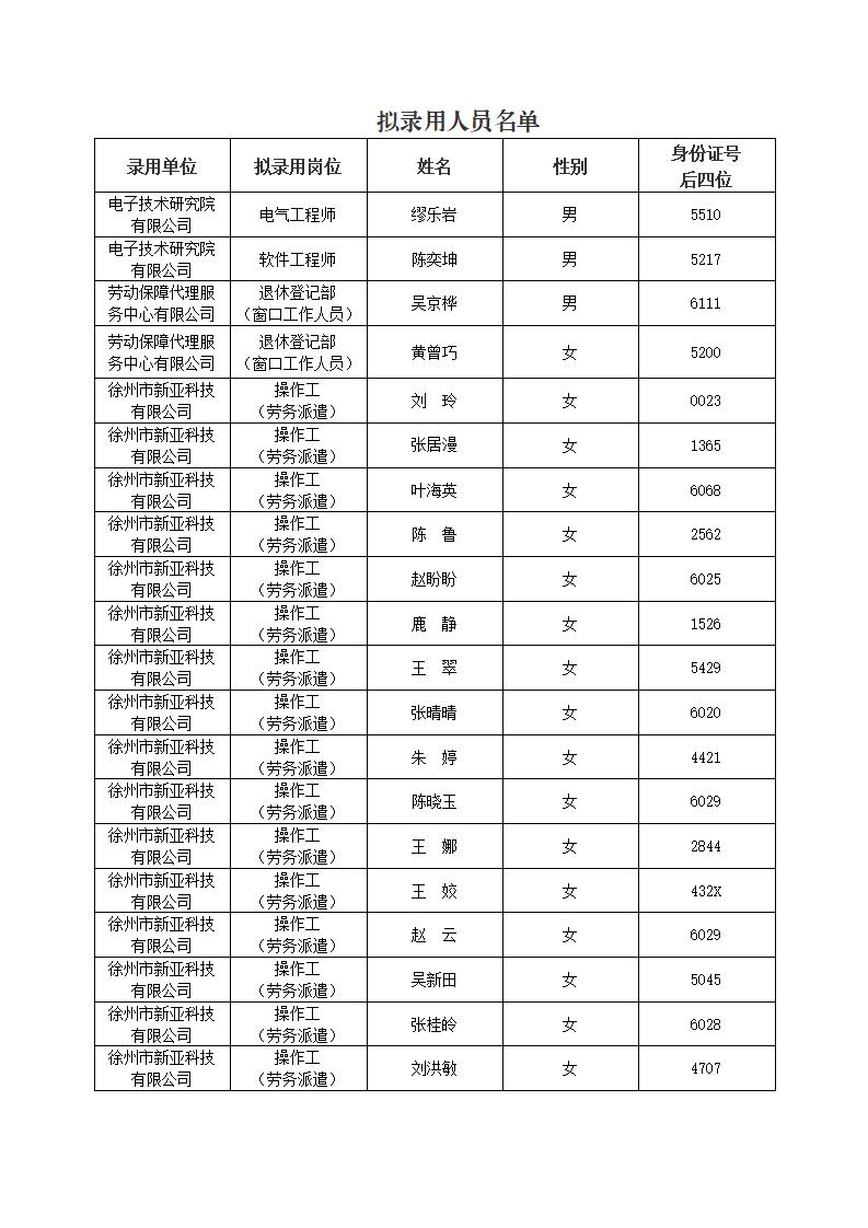 根據(jù)《徐州市國有資產投資經營集團有限公司招聘工作人員公告》相關要求,海鷗集團所屬電子技術研究院有限公司、勞動保障代理服務中心有限公司、徐州市新亞科技有限公司公開招聘工作已經完成,現(xiàn)將擬錄用人員名單進行公示。公示期自2023年5月6日起至5月11日止。如對公示對象錄用資格有異議,請于公示期內向海鷗集團組織人事部(紀檢監(jiān)察室)反映。