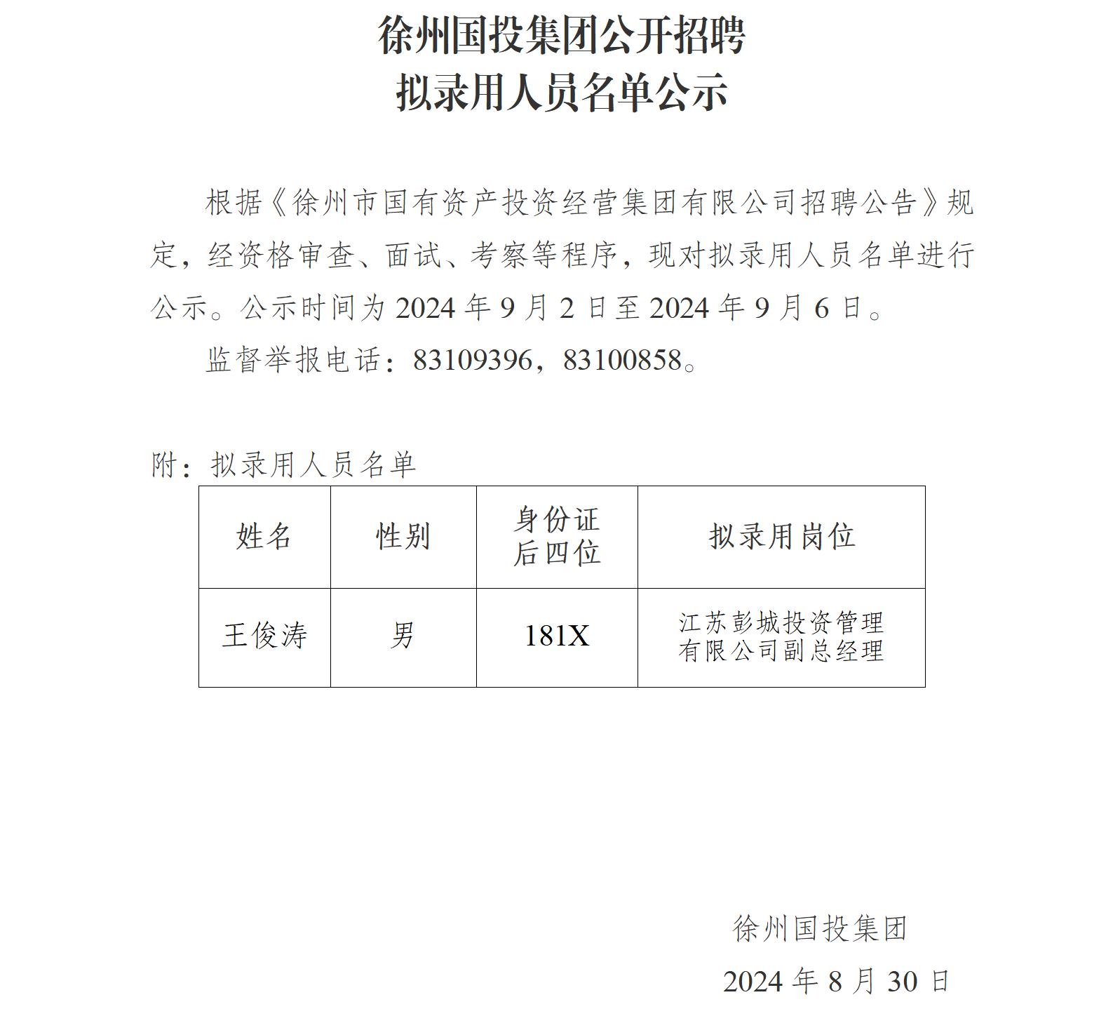 徐州國投集團公開招聘擬錄用人員名單公示