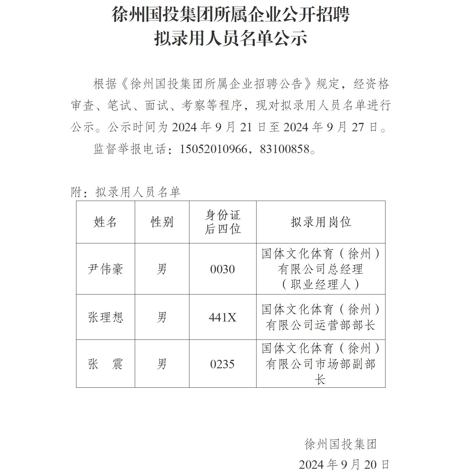 徐州國投集團所屬企業(yè)公開招聘擬錄用人員名單公示