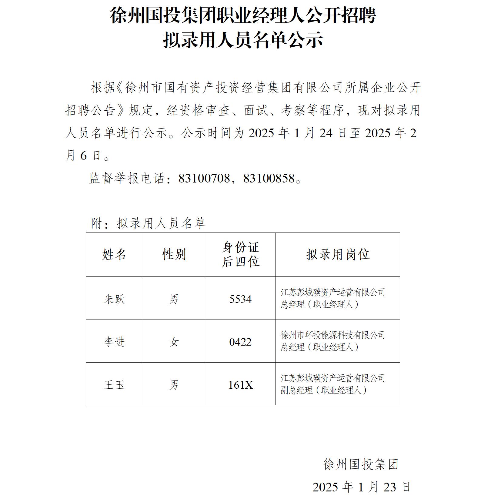 徐州國(guó)投集團(tuán)職業(yè)經(jīng)理人公開(kāi)招聘擬錄用人員名單公示