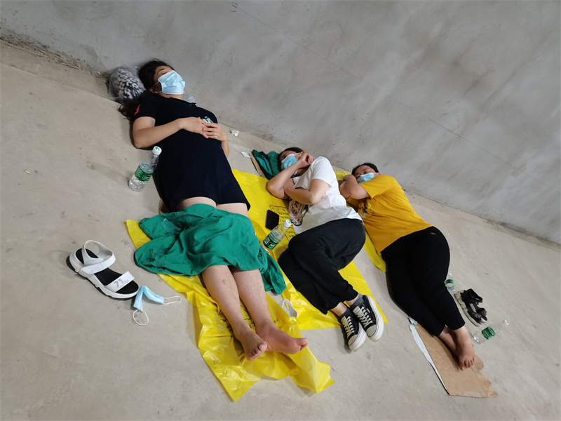 條件的簡陋,為采樣工作增加了難度。在炎熱的環(huán)境下,她們穿著密不透風(fēng)的防護(hù)服,帶著N95口罩、面屏和多層手套,不停地為持續(xù)不斷到來的居民進(jìn)行采樣。大到90多歲的老人,小到幾個月的嬰兒,一直戰(zhàn)斗到晚上11點(diǎn)多,在8個小時的時間里,憑著她們麻利地操作和熟練的技術(shù),共為4000人完成了核酸采樣。采樣結(jié)束后,有的姐妹累得撐不住了,脫了防護(hù)服,顧不得雨天地面的潮濕,直接躺在了生硬的水泥地上。
