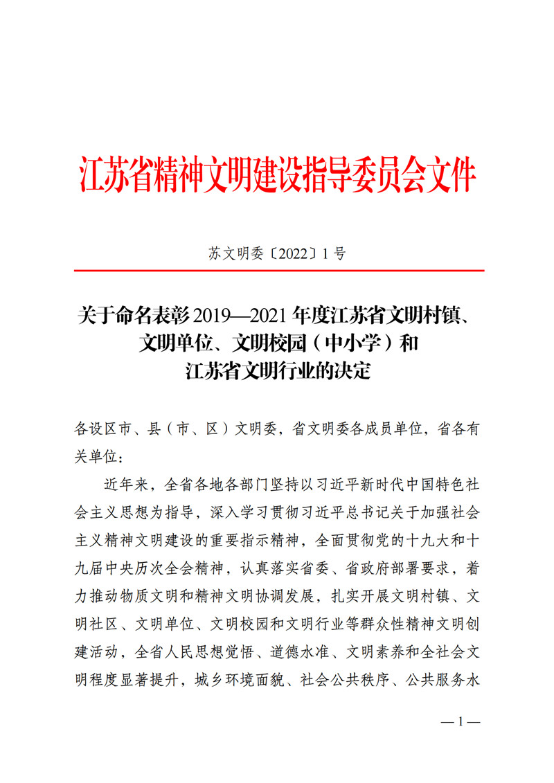 近日,江蘇省精神文明建設(shè)指導(dǎo)委員會(huì)印發(fā)《關(guān)于命名表彰2019年度-2021年度江蘇省文明村鎮(zhèn)、文明單位、文明校園(中小學(xué))和江蘇省文明行業(yè)的決定》(蘇文明委2022〔1〕號(hào)),徐州國投集團(tuán)(本部)榮獲2019—2021年度“江蘇省文明單位”榮譽(yù)稱號(hào)。