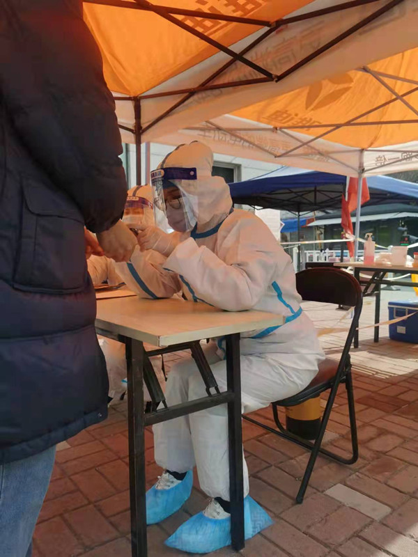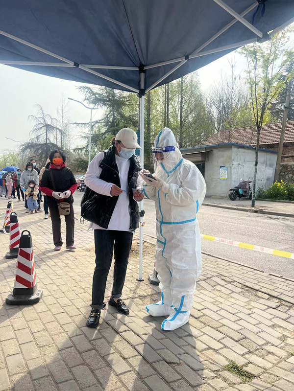 徐鑫在3月28日晚接到云龍區(qū)急需志愿者的通知后,沒有片刻地猶豫,立即報名,以最快速度加入了首批志愿者行列,從協(xié)助醫(yī)護及社區(qū)工作人員進行第一輪核酸檢測服務(wù)開始,一直到現(xiàn)在,徐鑫已堅守在志愿者崗位長達10天,是華強資產(chǎn)公司服務(wù)時間最長的一位志愿者,他所服務(wù)的社區(qū)多達4個,橫跨云龍區(qū)、泉山區(qū)。在核酸檢測服務(wù)中,徐鑫始終堅守一線,化身全能“大白”,儼然已成為后續(xù)報到的志愿者們的“導(dǎo)師”,上午采集黃碼人員信息,下午上門核發(fā)通行證,搬運物資,維持秩序,參與每日例會,為社區(qū)疫情防控積極建言獻策……志愿者的全線崗位都有徐鑫奔波忙碌的身影,他堅定地向社區(qū)保證:“戰(zhàn)‘疫’不停,絕不離崗”!