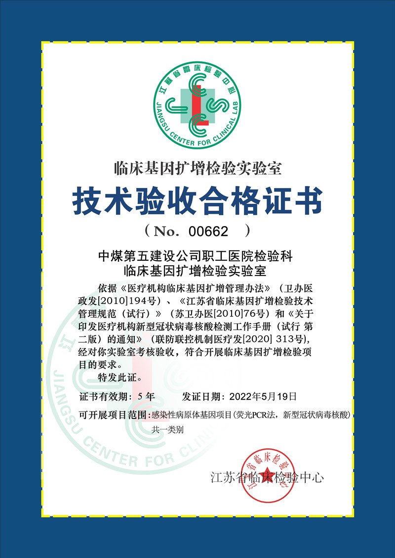 5月19日江蘇省臨床檢驗(yàn)中心頒發(fā)了《中煤第五建設(shè)公司職工醫(yī)院檢驗(yàn)科臨床基因擴(kuò)增檢驗(yàn)實(shí)驗(yàn)室技術(shù)驗(yàn)收合格證書(shū)》(NO 00662)。中煤五建職工醫(yī)院將以此為契機(jī),抓住機(jī)遇,創(chuàng)新發(fā)展,圍繞“完善質(zhì)控體系、提升醫(yī)療質(zhì)量、加強(qiáng)學(xué)科建設(shè)”的目標(biāo),全方位做好醫(yī)院各項(xiàng)工作,實(shí)現(xiàn)醫(yī)院發(fā)展再邁一個(gè)新臺(tái)階。