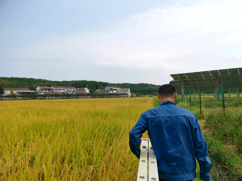 太湖鑫能電站位于安慶山區(qū),總裝機(jī)容量2萬千瓦,占地面積647畝,分別在三個(gè)不同地方,區(qū)域跨度大、道路條件差,有些光伏區(qū)甚至無法通車,只能攜帶沉甸甸的維修設(shè)備徒步前行,身體和設(shè)備維修都面臨著極大考驗(yàn)。10月1日上午11時(shí),驕陽似火,“秋老虎”的回歸使氣溫重返36度。電站班長謝文理帶領(lǐng)巡檢人員走在狹窄的田埂上,厚重的工作服下早已滲滿了汗水,他們已經(jīng)徒步巡檢了3公里的線路,走在最前面的謝文理在匯報(bào)完工作進(jìn)度后,轉(zhuǎn)頭對(duì)同行人員說“12點(diǎn)前必須把這個(gè)區(qū)域仔細(xì)巡檢一遍,下午再去剩下的區(qū)域”。說著他加快了腳步,一行人在泥濘的地面上留下了一串串深深的腳印。