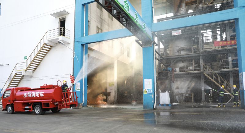 本次應(yīng)急演練活動現(xiàn)場位于危廢處置中心危險廢物焚燒車間,模擬場景設(shè)計為巡檢人員在更換窯頭噸桶廢液時,由于操作不當(dāng),回流管從收集桶中甩出至地面,廢液飛濺到巡檢人員額面部,造成灼傷。同時,廢液濺至回轉(zhuǎn)窯周邊遇熱燃燒,并點燃回流管不斷涌出的廢液。事故發(fā)生后,危廢中心應(yīng)急救援隊伍各司其職,消防與搶險救災(zāi)組使用滅火器、消火栓、消防水炮霧化滅火;警戒保衛(wèi)組對事故現(xiàn)場警戒;醫(yī)療救護(hù)組對受傷人員進(jìn)行心肺復(fù)蘇急救,將受傷員工外送就醫(yī);環(huán)境保護(hù)組打開應(yīng)急水池閘門,做好消防水及洗消水的收集工作。通過各現(xiàn)場應(yīng)急救援組織機(jī)構(gòu)協(xié)同努力,緊急情況得以解除,現(xiàn)場經(jīng)洗消檢驗后恢復(fù)正常狀態(tài)。