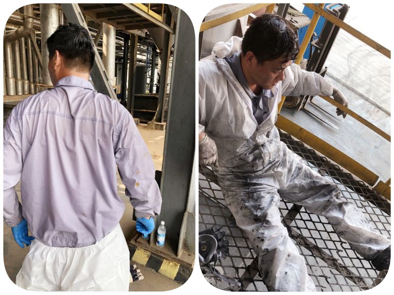 危廢處置中心焚燒車間的員工們正對焚燒爐進行檢修,此時爐內的溫度臨近60℃,汗水從額頭、臂膀、后背不斷滴落。