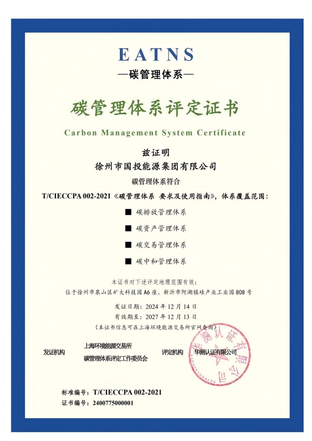 近日,在江蘇彭城碳資產(chǎn)運營有限公司的專業(yè)咨詢協(xié)助下,經(jīng)華測認證有限公司專家組的嚴格評審,能源集團成功通過碳管理體系認證審核,并獲得由上海環(huán)境能源交易所頒發(fā)的EATNS碳管理體系證書,成為全市率先獲得該體系認證的企業(yè)。同時,碳資信評價等級實現(xiàn)AA,標志著企業(yè)在“雙碳”管理工作方面取得了重大突破。