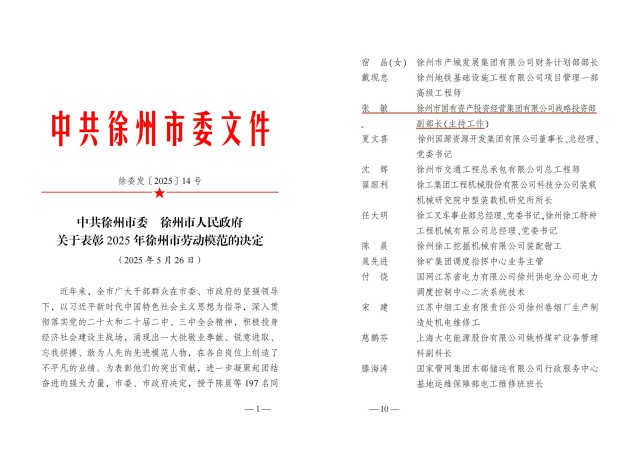 2025年5月28日,徐州市勞動(dòng)模范表彰大會(huì)召開,徐州國(guó)投集團(tuán)戰(zhàn)略投資部副部長(zhǎng)(主持工作)張敏榮獲“徐州市勞動(dòng)模范”稱號(hào)!