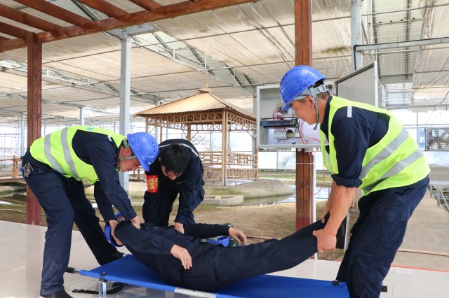 14時(shí)35分,刺耳的警報(bào)劃破寧?kù)o,觸電搶救應(yīng)急演練率先登場(chǎng)。四名電站運(yùn)維員工組成的應(yīng)急小組迅疾響應(yīng),嚴(yán)格按照預(yù)案流程行動(dòng)。只見一人果斷切斷電源,另一人利用絕緣桿將“觸電者”安全脫離危險(xiǎn)區(qū),其余隊(duì)員立即上前進(jìn)行規(guī)范的心肺復(fù)蘇急救。整個(gè)過程緊張有序,展現(xiàn)了團(tuán)隊(duì)在突發(fā)險(xiǎn)情中的高效協(xié)作與過硬技能。演練結(jié)束,安全專家即時(shí)點(diǎn)評(píng),對(duì)脫離電源的技術(shù)要點(diǎn)與心肺復(fù)蘇操作標(biāo)準(zhǔn)進(jìn)行強(qiáng)化講解,切實(shí)提升現(xiàn)場(chǎng)人員的應(yīng)急實(shí)戰(zhàn)能力。